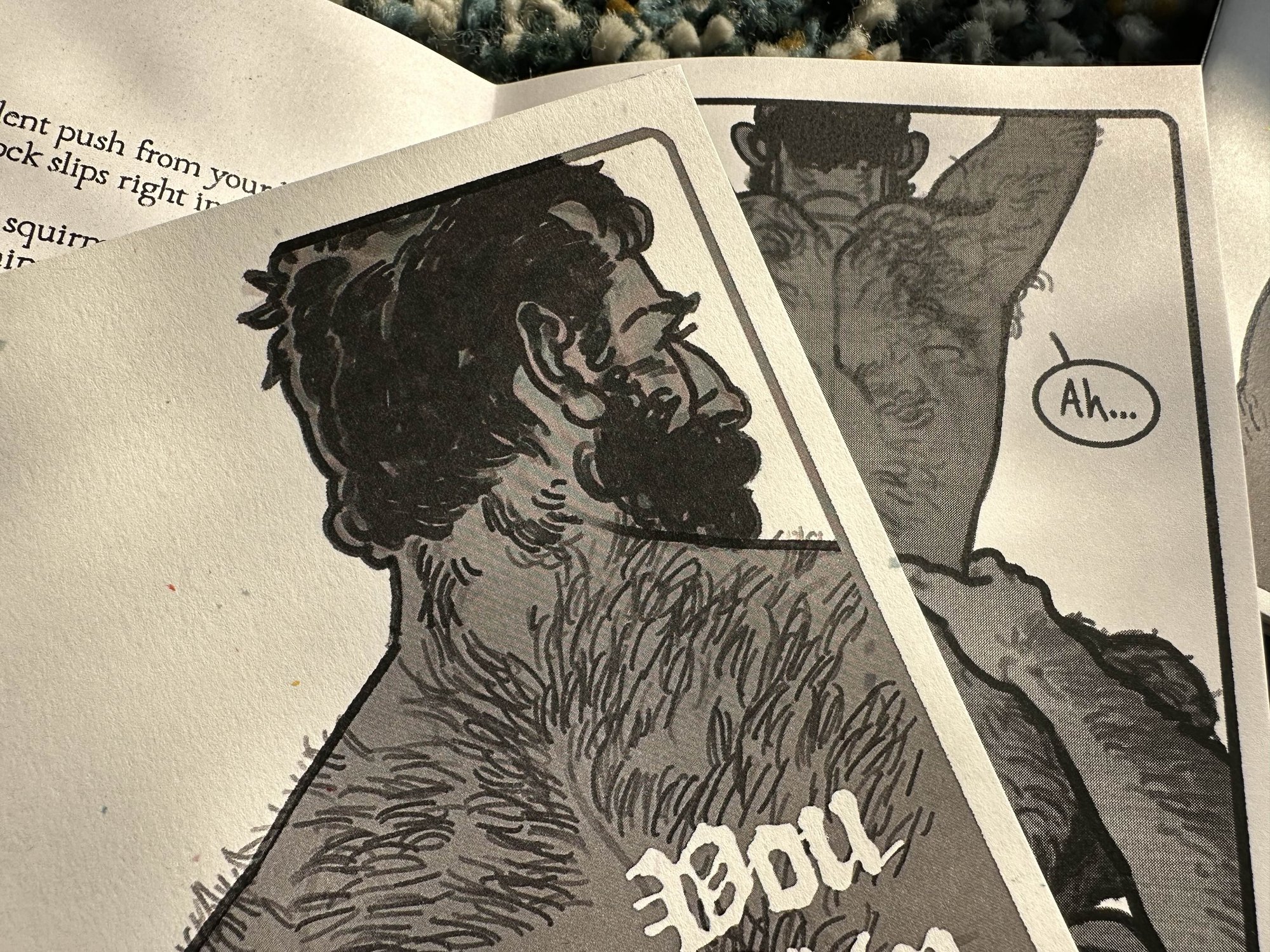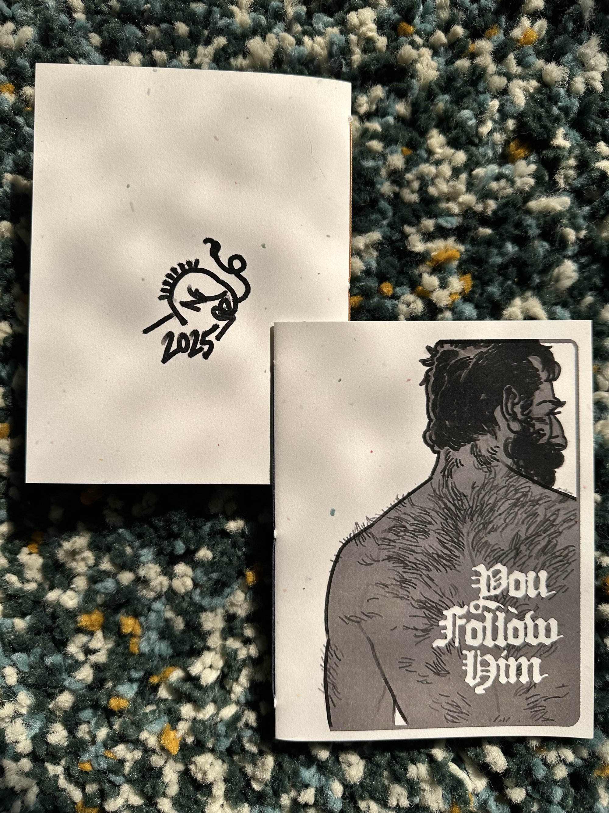 8 pages of illustrations featuring copious body hair, and 8 pages of narrative fiction. Printed and hand-bound by the artist, the book comes with one of 10 different binding thread colors.
